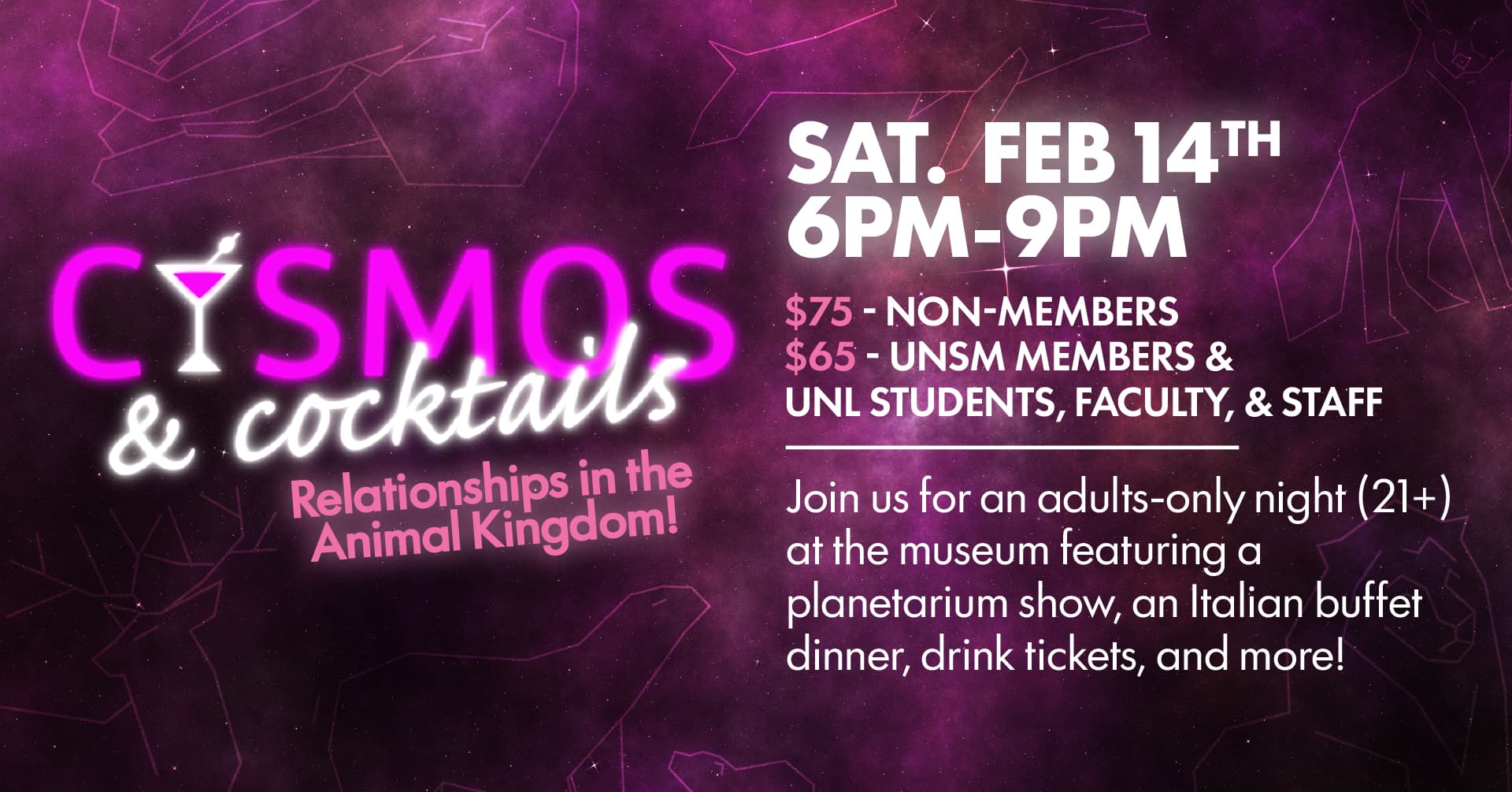 With stars in your eyes and cosmos in your hands, enjoy an adults-only (21+) night out at the museum. Cosmos & Cocktails includes a live-narrated planetarium show, dinner, 2 drink tickets (cash bar also available), museum exploration, and some fun activities. Drink in hand, explore four floors of natural history and world cultures exhibits, including several new or recently renovated exhibits.